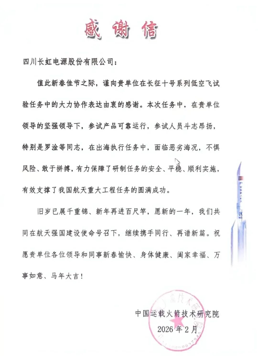 任務(wù)圓滿完成后,長虹電源收到中國運(yùn)載火箭技術(shù)研究院發(fā)來的感謝信,對其在長征十號系列低空飛行試驗(yàn)任務(wù)中的全力協(xié)作與鼎力支持致以誠摯謝意。在長虹電源參試團(tuán)隊(duì)遠(yuǎn)赴海上執(zhí)行任務(wù)期間,直面惡劣海況的嚴(yán)峻考驗(yàn),不畏艱險(xiǎn)、勇毅拼搏,全程保障研制任務(wù)安全平穩(wěn)推進(jìn),為我國航天重大工程的成功實(shí)施提供了有力支撐。